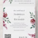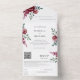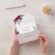 Customisable white All In One wedding Invitation. Features burgundy, carmine, marsala red floral bouquets of flowers. With a RSVP tear off return card that also features a handy QR code that links guests directly to your wedding website. To generate a brand new "unique to you" QR code, enter your wedding website URL address in the area provided in the " personalise this template " feature. A brand new QR code will appear on the design that will link directly to your wedding website by scanning the QR code with the camera on a smartphone.