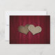 Rustic burgundy wedding RSVP card featuring a mason jar and two burlap hearts with initials against a rustic wood background. Easily personalise this cute rustic burgundy RSVP card online.