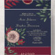 Elegant, rustic, navy blue and burgundy all-in-one wedding invitation with monogram - initials of bride and groom, rose gold pink flowers and custom picture of the couple.