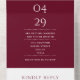 An elegant burgundy minimalist all-in-one wedding invitation featuring your special date and wedding details set in classic, chic typography. The invitation includes a perforated RSVP card with your wedding website QR code and details. Designed by Thisisnotme©