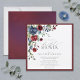 Modern, elegant square bridal shower invitation featuring a bouquet of burgundy and navy blue flowers and botanical greenery, bordered in a rich burgundy red. Personalize your bridal shower details in soft off-black, accented with beautiful modern hand lettered calligraphy. The back of the card features an abstract burgundy red texture. Copyright Elegant Invites, all rights reserved.