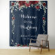 A burgundy navy Welcome To Our Wedding tapestry sign featuring a watercolor painted scenery of burgundy red peonies and silver eucalyptus greenery with 2 cascading vines on either side of pretty white calligraphy script welcoming your guests to your wedding with your first names and numerical wedding date against a solid navy blue background.
