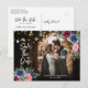 Custom navy blue and burgundy wedding photo save the date postcard featuring floral arrangements on a barn wood adorned with string lights. Easily personalise this floral wedding photo save the date postcard with your event details.