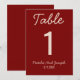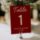 Classy and elegant whimsical cream and deep red wedding table numbers. As you see it features a burgundy background with cream beige script that match the whole suite.