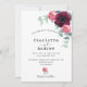 A chic white background. Decorated with burgundy and pink watercolored roses, florals flowers and eucalyptus greenery. Personalise and add your names and wedding details. Black letters.