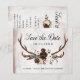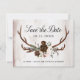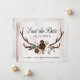 This rustic floral wedding save the date flat card features a rustic design of antlers with hand painted burgundy and blush pink watercolor roses with greenery and feathers on a watercolor background of champagne and tan . Above in elegant black script it reads "Save the Date" with your wedding date and names to personalise. The back of the card has more details of your wedding day to customise. Best of wishes on your engagement and wedding! Designed by Susan Coffey.