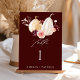This wedding table number features watercolor white and yellow pumpkins adorned with burgundy, maroon, and blush pink flowers over fall leaves. For more advanced customisation of this design, please click the BLUE DESIGN TOOL BUTTON above