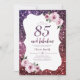 Burgundy purple faux sparkle glitter background and pink floral with "85 and fabulous" script in centre, elegant and stylish, great milestone 85th birthday party invitations.