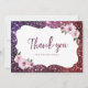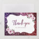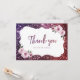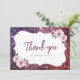 Burgundy purple faux sparkle glitter background and pink floral with "thank you" script in centre, elegant and stylish, great thank you cards for birthday party, bridal shower, or baby shower.