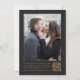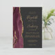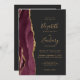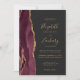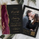 The left-hand edge of this elegant modern wedding invitation features a burgundy red watercolor agate border trimmed with faux gold glitter. The customisable text combines gold-coloured handwriting, copperplate and italic fonts on a dark charcoal grey background. Add your favourite photo to the reverse side, along with additional text and a QR code to send guests to your wedding website.