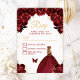 This elegant and glamourous rsvp card features a beautiful princess with blonde hair in a burgundy red ball gown. The text combines handwritten script and modern sans serif fonts for a classy and sophisticated look. The floral arrangements, butterfly and gold confetti create the perfect blend of rustic and chic. Perfect for a sweet sixteen party or birthday party.
