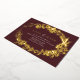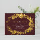 Elegant save the date cards with real metallic foil. Vintage-style florals frame your details. Gold on a contrasting dark red background.
