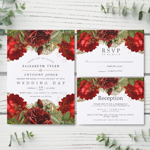 Chic vintage burgundy red roses engagement party invite with accents of gold.