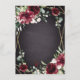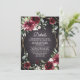 Design features a black chalkboard printed texture for the background with a printed gold coloured geometric frame that’s covered in unique elegant greenery that consists of eucalyptus and other leaves/branch elements. Design also features burgundy red rose and peony flowers and other blush pink floral elements for added unique décor.