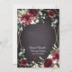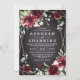 Design features a black chalkboard printed texture for the background with a printed gold coloured geometric frame that’s covered in unique elegant greenery that consists of eucalyptus and other leaves/branch elements. Design also features burgundy red rose and peony flowers and other blush pink floral elements for added unique decor.