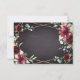 Design features a black chalkboard printed texture for the background with a printed gold coloured geometric frame that’s covered in unique elegant greenery that consists of eucalyptus and other leaves/branch elements. Design also features burgundy red rose and peony flowers and other blush pink floral elements for added unique décor.