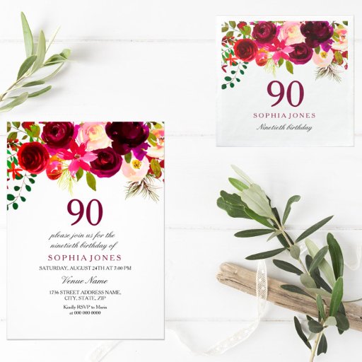 Burgundy Red Boho Floral 90th Birthday Party Invitation