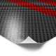 A sporty burgundy red racing stripes accent on black carbon fibre style decor. The carbon fibre print look suits automotive, modern, and industrial tastes and the vibrant vertical lines make for a dynamic design.