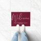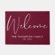 An elegant burgundy red doormat featuring beautiful script calligraphy welcome and personalised with your family name and special date. Designed by Thisisnotme©