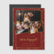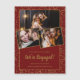 Gold confetti decorates the burgundy red background on both the front and back. Three couple's photographs are featured on the front. All of the text below including the large We're Engaged can be edited to customise your unique engagement announcement.