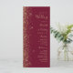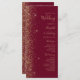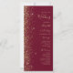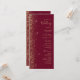 The left-hand edge of this elegant modern wedding program features a gold faux glitter design. The customisable text combines pale gold-coloured handwriting, copperplate and italic fonts on a burgundy red background.