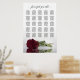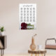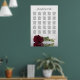 This beautiful 25 table wedding seating chart includes table assignments for 250 guests at the traditional 10 seats per table. The design is romantic and elegant with a single long-stemmed burgundy, maroon, or wine red coloured rose reflecting in a pool of water with waves and ripples. The title reads: Please find your table, and is written in fancy script calligraphy. There is space for the names of the couple and the wedding date below. Wonderful way to help your guests find their seats while adding a touch of elegance to your wedding reception.