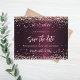A modern and elegant Save the Date for a 50th birthday party. A deep burgundy gradient background. Decorated with rose gold confetti. Personalise and add date, place, name and age. Rose gold coloured text.
