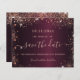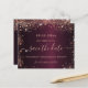 A modern Save the Date card for a 50th (or any age) birthday party. A burgundy background colour. Decorated with rose gold faux sparkles. The text: Save the Date is written with a large trendy hand lettered style script.
