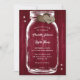 Custom rustic burgundy wedding invitation featuring a mason jar and burlap hearts on a barn wood background. Easily personalise this mason jar wedding invitation with your wedding details.