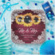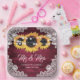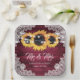 Personalised burgundy rustic wedding paper plates featuring sunflowers on a barn wood background adorned with white floral lace and string lights. Matching items available to complement these burgundy rustic chic wedding paper plates inspired by sunflower flowers.