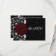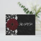 Cute and classy matching rsvp card collection features black background with subtle swirling scrolls, and a vivid white swirl foreground design with burgundy maroon gerbera gerber daisy flower. Perfectly elegant for a winter wedding, or any season.