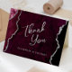 This trendy modern wedding thank you card features a burgundy red watercolor agate background trimmed with faux silver glitter. The customizable text features the words "Thank You" in silver gray handwriting script. Add the names of the newlyweds below.