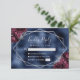 This elegant wedding RSVP card features a silver geometric frame decorated with burgundy and silver floral bouquets on a navy blue faux foil background. The customisable text combines silver grey whimsical handwriting and copperplate fonts. The blue foil image is repeated on the back.