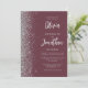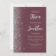 The left-hand edge of this elegant modern wedding invitation features a silver faux glitter border. The customisable text combines pale silver grey script and sans serif fonts on a burgundy background. The reverse side features a matching burgundy and silver design.