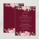 An elegant floral wedding enclosure card featuring pink watercolor flowers with modern handwritten calligraphy on a burgundy red background.
