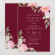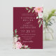 An elegant floral wedding invitation featuring pink watercolor flowers with modern handwritten calligraphy on a burgundy red background.
