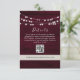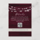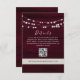 Boho, elegant, country, string lights on rustic wood marsala burgundy wedding details card with QR code and website.