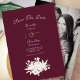 This Save the Date Announcement has a burgundy background with a gold and white bold floral. It is simply elegant!