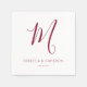 This wedding napkin design offers a simple and elegant handwritten style monogram. All text appears in burgundy on a clean white background. Personalise with the names of the bride and groom and their wedding date.