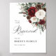 Matching items available including wedding invitations, RSVP cards, details cards, table numbers, menus, programs, place cards, and coordinated reception signage in the same burgundy floral collection.