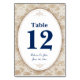 This wedding table number card features a vintage theme with a white oval on a burlap and lace background. The customisable text is navy blue and can be changed to another colour.