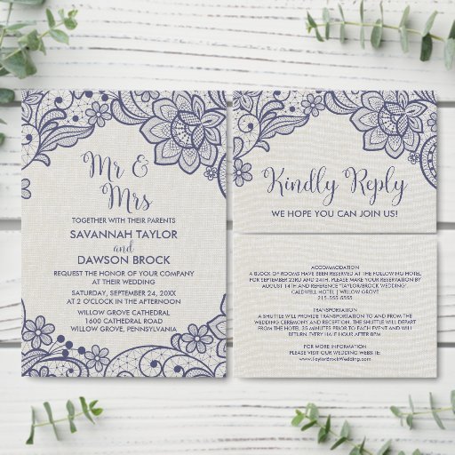 Burlap and Navy Lace Wedding Invitation SuiteDesigned by Miriam Kokolo