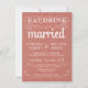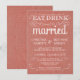 Eat, Drink, and be Married -- Vintage style rustic country wedding invitations -- Swirly, curly scrolls and old-fashion typography on coral peach pink burlap background. Add your names and wedding info in this easy to use template. Elegant but fun and whimsical, chalkboard style script writing can be modified for your formal or semi-formal retro wedding theme. Casual modern style is perfect for trendy contemporary weddings with a fun touch of sophisticated charm for the traditional bride and groom. Please contact us for help with customisation if you need additional room for your wedding details. Other sizes and chalkboard styles available.