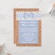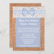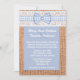 Sweet country charming wedding invitations, done in a burlap look, with a pale blue text area, on front. Graphics of white lace and a light blue and white gingham ribbon and bow stretch across the top. Personalise the white text for your special day. Matching wedding products available.