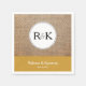 This simple and modern wedding napkin features a white circle with the monogram of the bride and groom on a photo of burlap background. Customisable text on a gold background near the bottom, features the names of the bride and groom and their wedding date.
