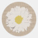 A stylish and modern sticker featuring a daisy over a background image of burlap. Look for matching wedding invitations and more at Jill's Paperie.