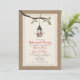 A wedding rehearsal invitation featuring an illustration of a lantern filled with red and blue flowers hanging from a tree branch with green leaves. Background on front and back is burlap inspired. Front features lace inspired design. Personalise the text with your information.
