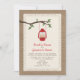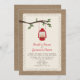An outdoors wedding invitation with a wilderness / camping theme featuring an illustration of a red oil lamp hanging from a tree branch with green leaves. Background on front and back is burlap inspired. Front features lace inspired design. Personalise the text with your information.