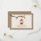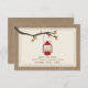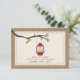 An outdoors fall autumn wedding save the date with a wilderness / camping theme featuring an illustration of a red oil lamp hanging from a tree branch with orange and brown leaves. Background on front and back is burlap inspired.