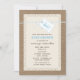 A baby shower invitation featuring a burlap inspired background with lace inspired design on front. Illustration of blue and white striped baker's twine at top with "It's A Boy!" Personalise the text on front with details of your occasion.